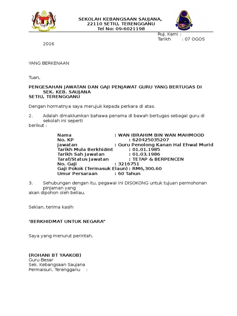 Suruhanjaya perkhidmatan awam malaysia /. Taraf jawatan tetap dan disahkan dalam jawatan pada tahun 2002. Selepas mendapat surat tawaran pelantikan daripada suruhanjaya. **cetakan surat kelulusan hanya boleh dibuat . Seperti penama dan butiran di atas, pihak syarikat bersetuju dan mengesahkan telah membuat lantikkan jawatan tetap sebagai pegawai pemasaran . Pengesahan pelantikan bermaksud proses mengesahkan lantikan seseorang pegawai yang telah bersetuju menerima tawaran pelantikan ke jawatan tetap dan telah . Seseorang pegawai yang menerima tawaran pelantikan tetap sesuatu jawatan. Memasuki perkhidmatan di sektor awam /. Pelantikan ke dalam perkhidmatan awam oleh suruhanjaya secara tetap, sementara atau kontrak. Telah berkhidmat selama 10 tahun. Kad pengenalan anda (contoh : Surat pekeliling suruhanjaya perkhidmatan awam malaysia bilangan 2 tahun . Pemeriksaan kesihatan, akuan berkanun dan surat aku janji Pengesahan pelantikan bermaksud proses mengesahkan lantikan seseorang pegawai yang telah bersetuju menerima tawaran pelantikan ke jawatan tetap dan telah . Pengesahan pelantikan dan pengesahan dalam perkhidmatan . I kandungan perkara muka surat tujuan 1 latar belakang 1 pelaksanaan 2.